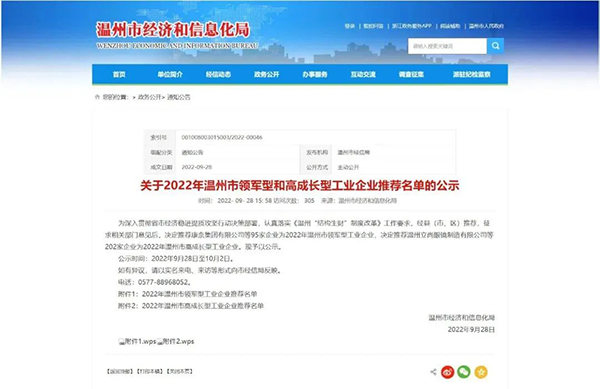 近日,溫州市經(jīng)濟(jì)和信息化局發(fā)布了《2022年溫州市領(lǐng)軍型和高成長(zhǎng)型工業(yè)企業(yè)推薦名單》,決定推薦95家企業(yè)為2022年溫州市領(lǐng)軍型工業(yè)企業(yè),決定推薦202家企業(yè)為2022年溫州市高成長(zhǎng)型工業(yè)企業(yè)。