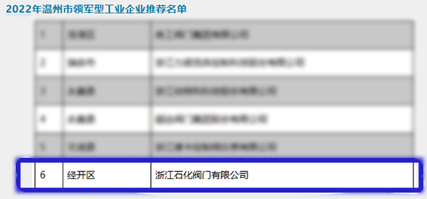 其中,浙江石化閥門(mén)有限公司榮獲2022年溫州市領(lǐng)軍型工業(yè)企業(yè)。